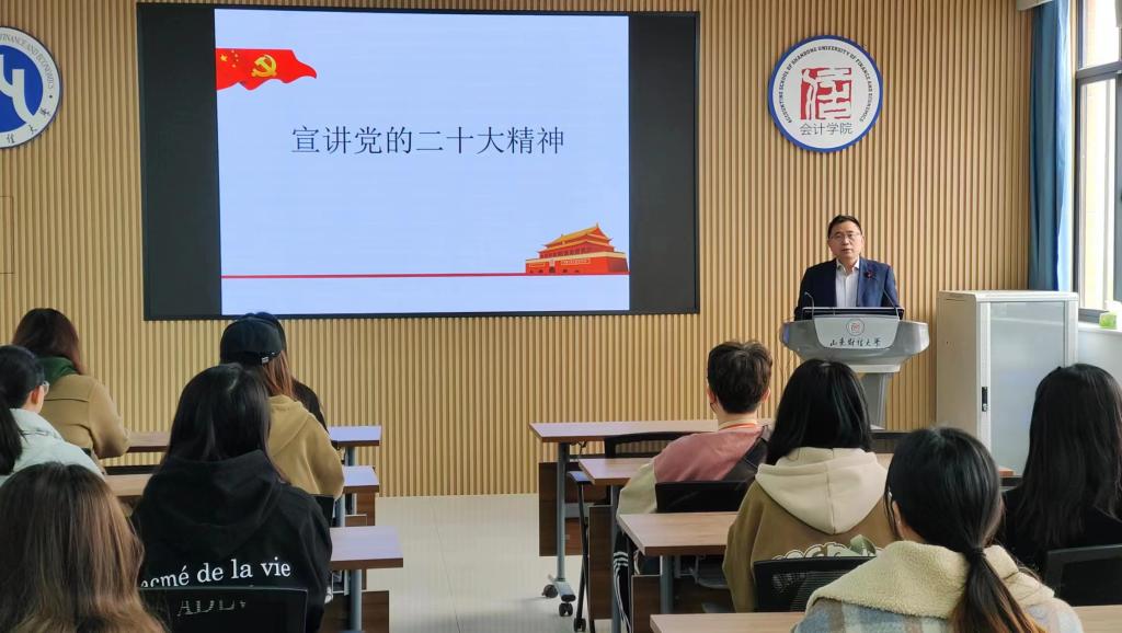 3月24日,会计学院在燕山校区举办就业推进主题班会暨党的二十大精神宣讲会,会计学院党委书记邵文涛为联系班级会计1906班的同学们宣讲党的二十大精神。